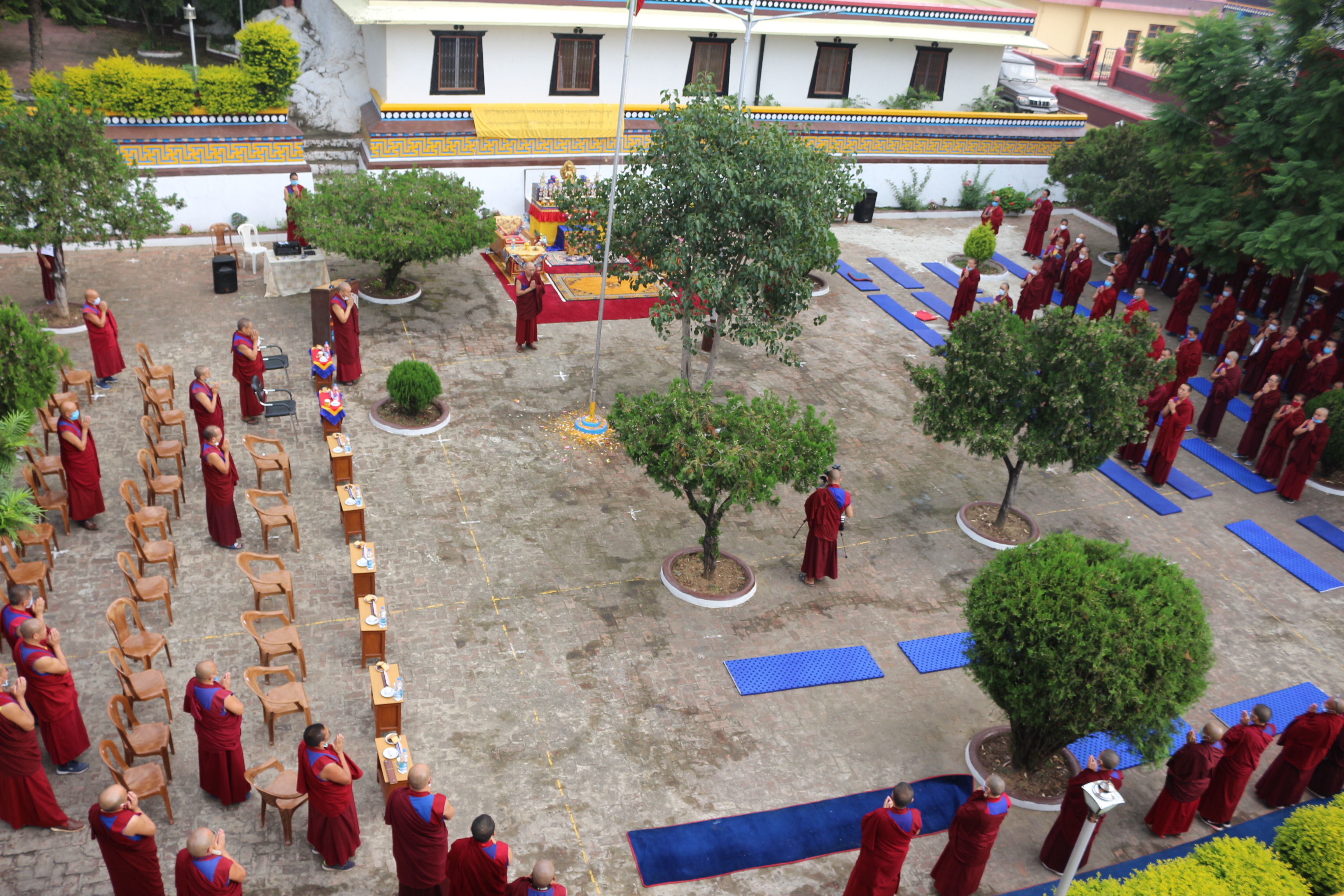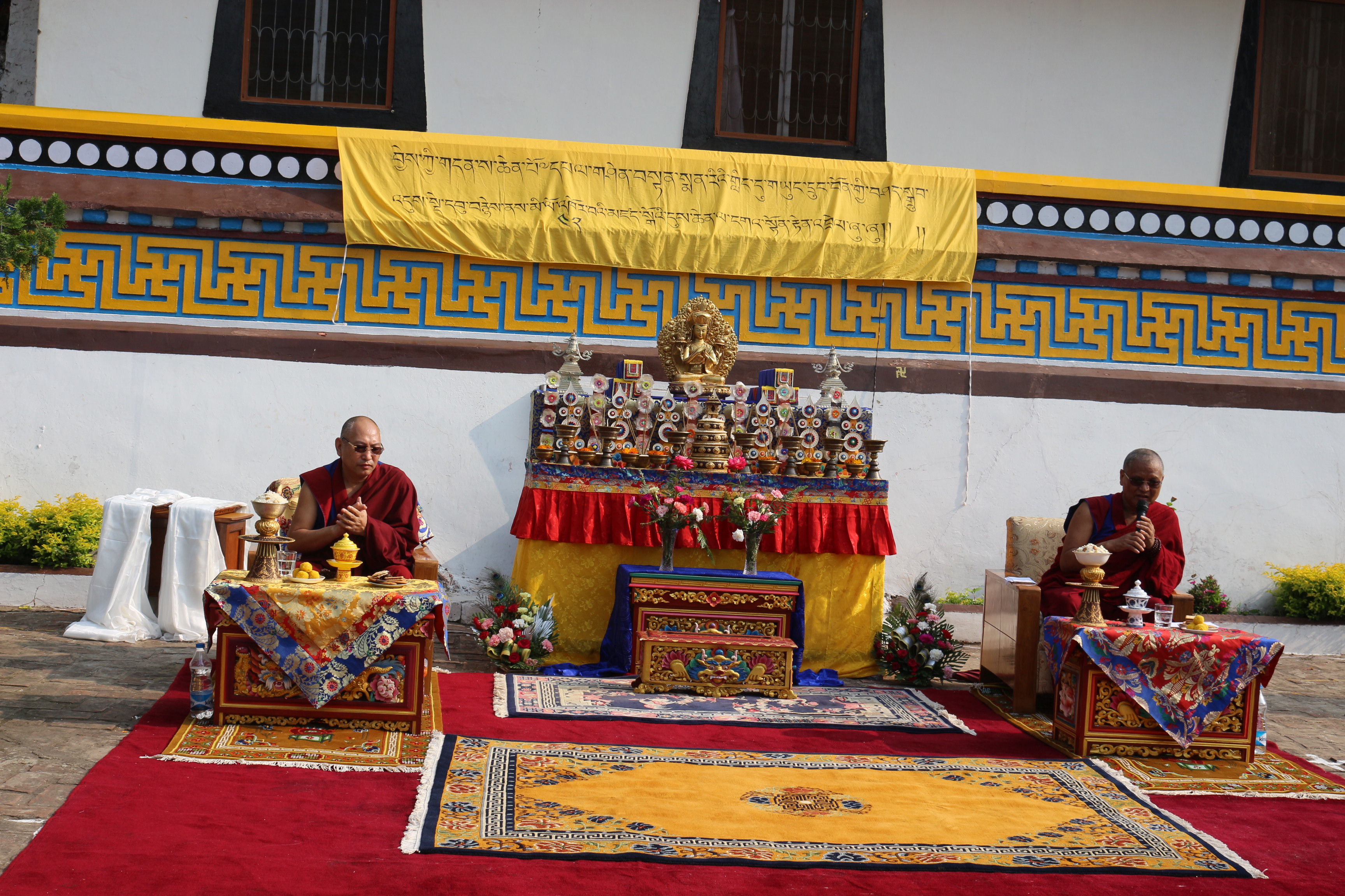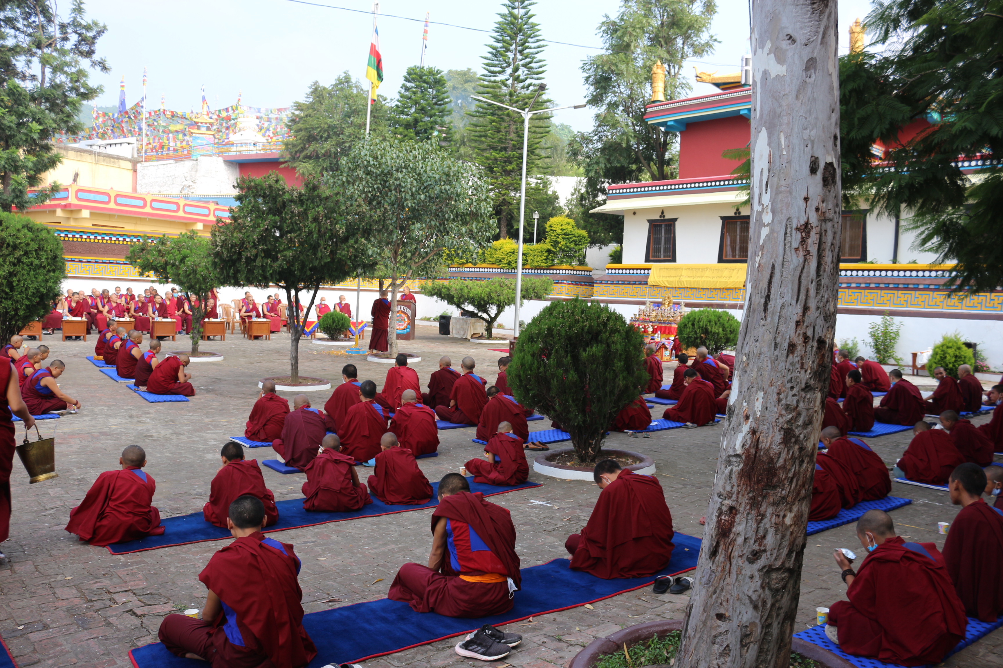 ཆུ་ཚོད་༨།༠༠ནས་བཤད་སྒྲུབ་འདུས་སྡེའི་ཚོགས་གཙོ་གཞོན་གཉིས་ཀྱིས་ལྷ་རྫས་དྲི་མ་མེད་པའི་སྤོས་དར་གྱིས་སྣེ་དྲངས་ཏེ། མཛད་སྒོའི་སྐུ་མགྲོན་གཙོ་བོ་༧ཞྭ་དཀར་བསྟན་པའི་གཙུག་རྒྱན་༧སྐྱབས་རྗེ་༧རྒྱལ་བ་སྨན་རིའི་ཁྲི་འཛིན་རིན་པོ་ཆེ་མཆོག་དང་། གསང་གསུམ་བསྟན་པའི་མཛོད་འཛིན་༧སྐྱབས་རྗེ་དཔོན་སློབ་ཡང་སྟོན་འཕྲིན་ལས་ཉི་མ་རིན་པོ་ཆེ་རྣམ་པ་གཉིས་གདན་ཞུས་ཀྱིས་༧སྐྱབས་རྗེ་ཁྲི་འཛིན་རིན་པོ་ཆེ་མཆོག་གིས་བཤད་སྒྲུབ་བསྟན་པའི་དར་ཆེན་མཁའ་དབྱིངས་སུ་སྒྲེང་འཛུགས་མཛད་དེ་ཀུན་གྱིས་དགའ་བའི་ཐལ་སྒྲ་དང་སྦྲགས་འདུས་མང་ཡོངས་ཀྱིས་བསྟན་པ་རྒྱས་པའི་སྨོན་ལམ་གསུང་བའི་མཇུག་གྲུབ་མཚམས་རང་རང་གི་བཞུགས་གྲལ་དུ་འཁོད་ནས་འབྲས་སིལ་གསོལ་ཇ་ཕུལ་བ་བཅས་སྔོན་འགྲོའི་མཛད་རིམ་ཡོངས་སུ་གྲུབ་པ་དང་།
