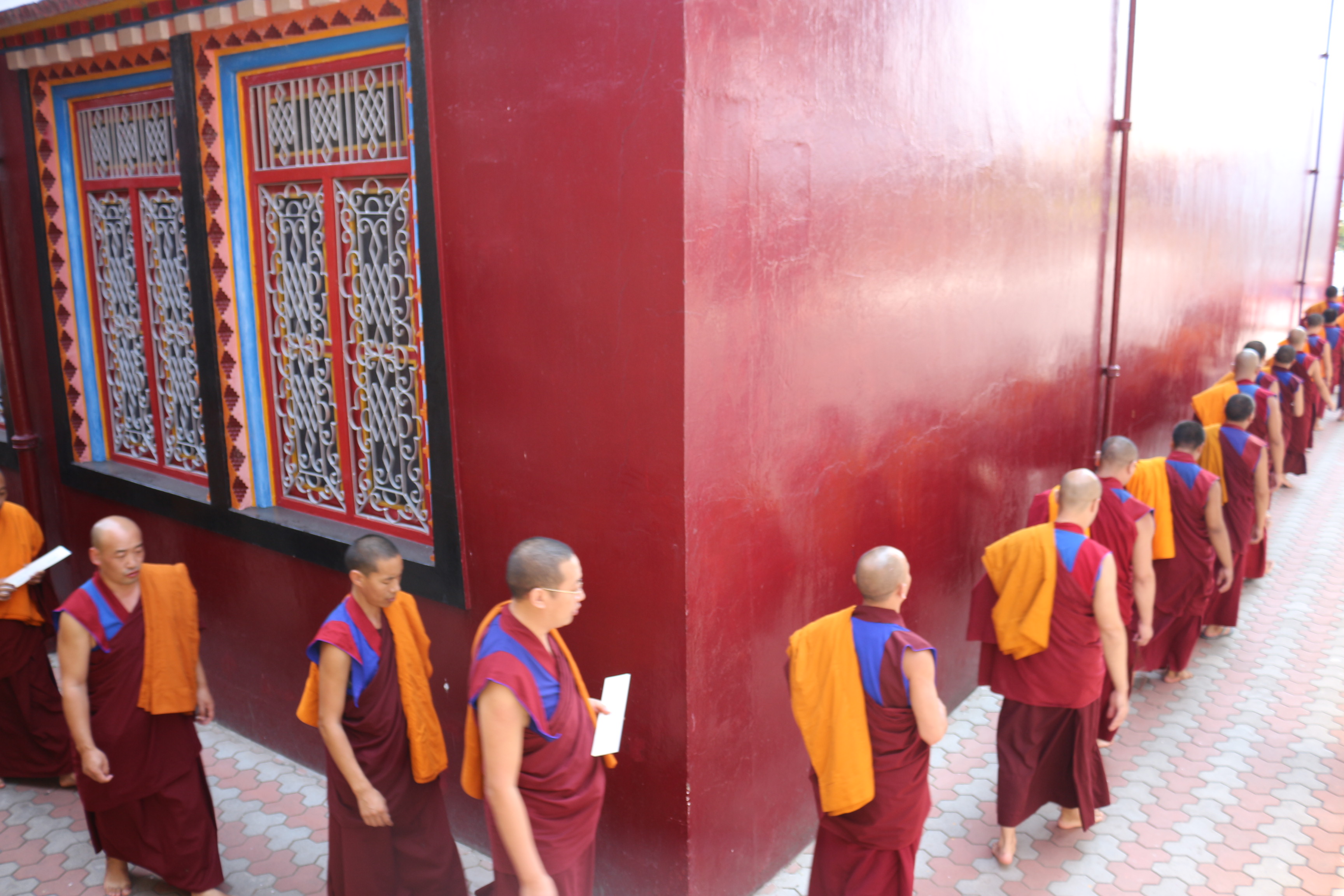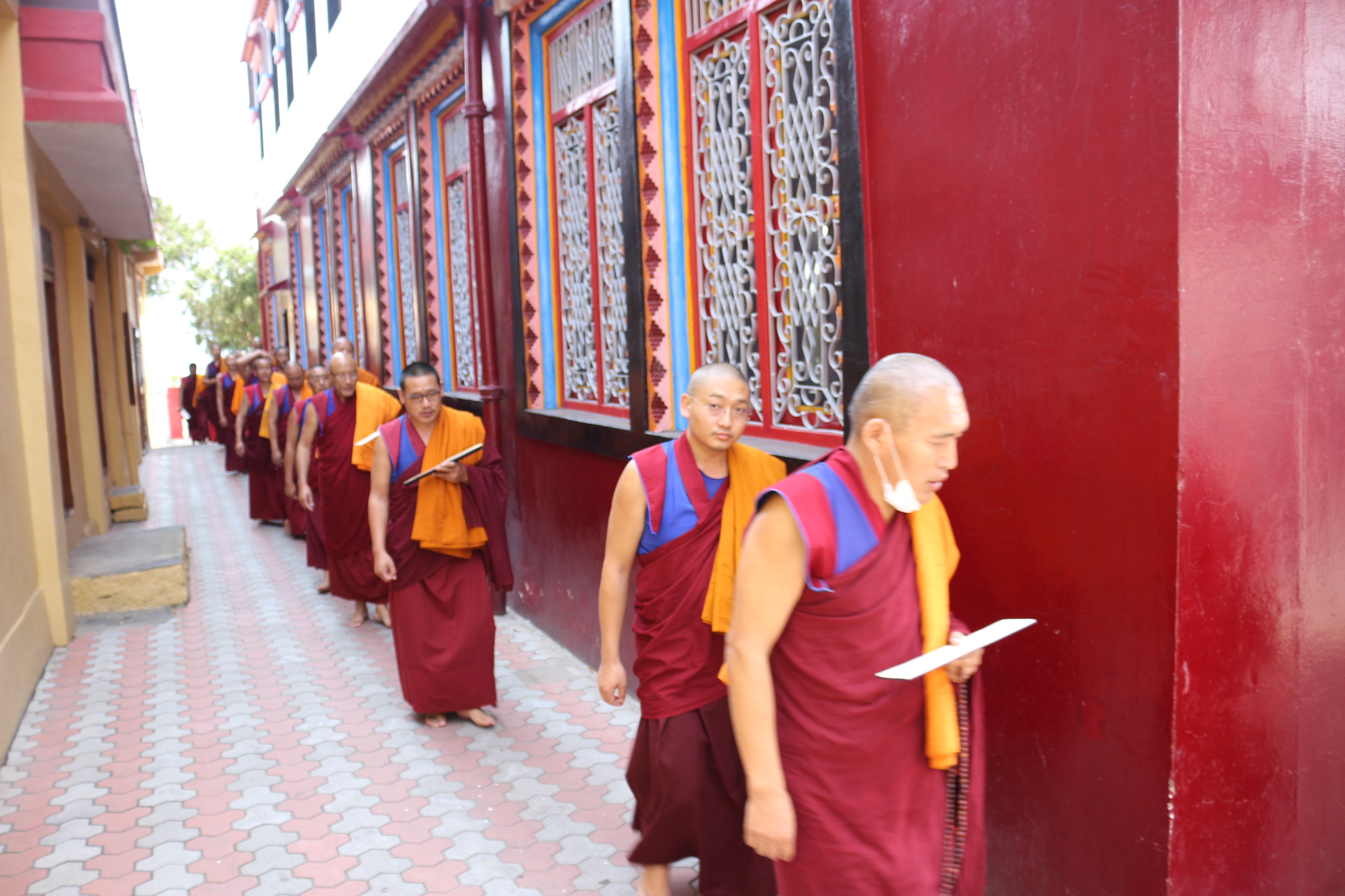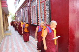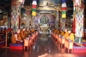 དེ་ཡང་༧སྐྱབས་རྗེ་མཁན་སློབ་རྣམ་གཉིས་དང་བཤད་སྒྲུབ་མཁན་སློབ་བཅས་ཉིན་རེའི་ཚོགས་མགོན་དུ་རེ་མོས་ཀྱིས་དབུ་བཞུགས་ཐོག་ཁྱིམ་སྤང་རབ་བྱུང་སེམས་དཔའ་འདུལ་འཛིན་པ་གཞུང་གི་ཚད་འཛིན་འདུ་འཛོམས་ལྔ་བཅུའི་གྲངས་ཚད་ལས་མ་འདས་པར་རྒྱལ་བ་གོང་མའི་ཕྱག་སྲོལ་ཇི་བཞིན་བོད་ཟླ་༨པའི་ཚེས་༡ནས་དབུ་བཙུགས་ཏེ་༧གདན་ས་འདིར་འཚོགས་ཡོད་པ་རེད། དེ་ཡང་བདག་ཅག་གི་སྟོན་པ་རྣམ་འདྲེན་བརྒྱད་པ་རྫོགས་པའི་སངས་རྒྱས་དེ་ཉིད་ཡང་ཕྱི་རབས་སེམས་ཅན་རྣམས་ལ་དཔེ་བསྟན་ཕྱིར་སྐྱེ་རྒ་ན་འཆིའི་ཆུ་བོ་བཞི་ལ་གཟིགས་ནས་། རྒྱལ་སྲིད་འཁོར་དང་ཟང་ཟིང་རྣམས་སྤངས་ནས་གཅིག་པུ་རབ་བྱུང་དང་དྲང་སྲོང་ལེགས་ལྡན་རྒྱལ་བའི་མདུན་ནས་དག་པ་དྲང་སྲོང་གི་བསྙེན་རྫོགས་མཛད་ཅིང་དཀའ་ཐུབ་རྣམ་གསུམ་གྱི་ལུང་ནོད་ནས་བྱ་སྤྲེལ་མི་གསུམ་གྱི་དཀའ་ཐུབ་ལོ་དགུ་མཛད་ཅིང་ཉིན་རེ་ཟས་འབྲུ་རྡོག་རེ་དང་ཆུ་ཐིགས་པ་རེ་གསོལ་ནས་དཀའ་ཐུབ་རྣམ་གསུམ་མཐར་ཕྱིན་པར་མཛད་པ་དང་།