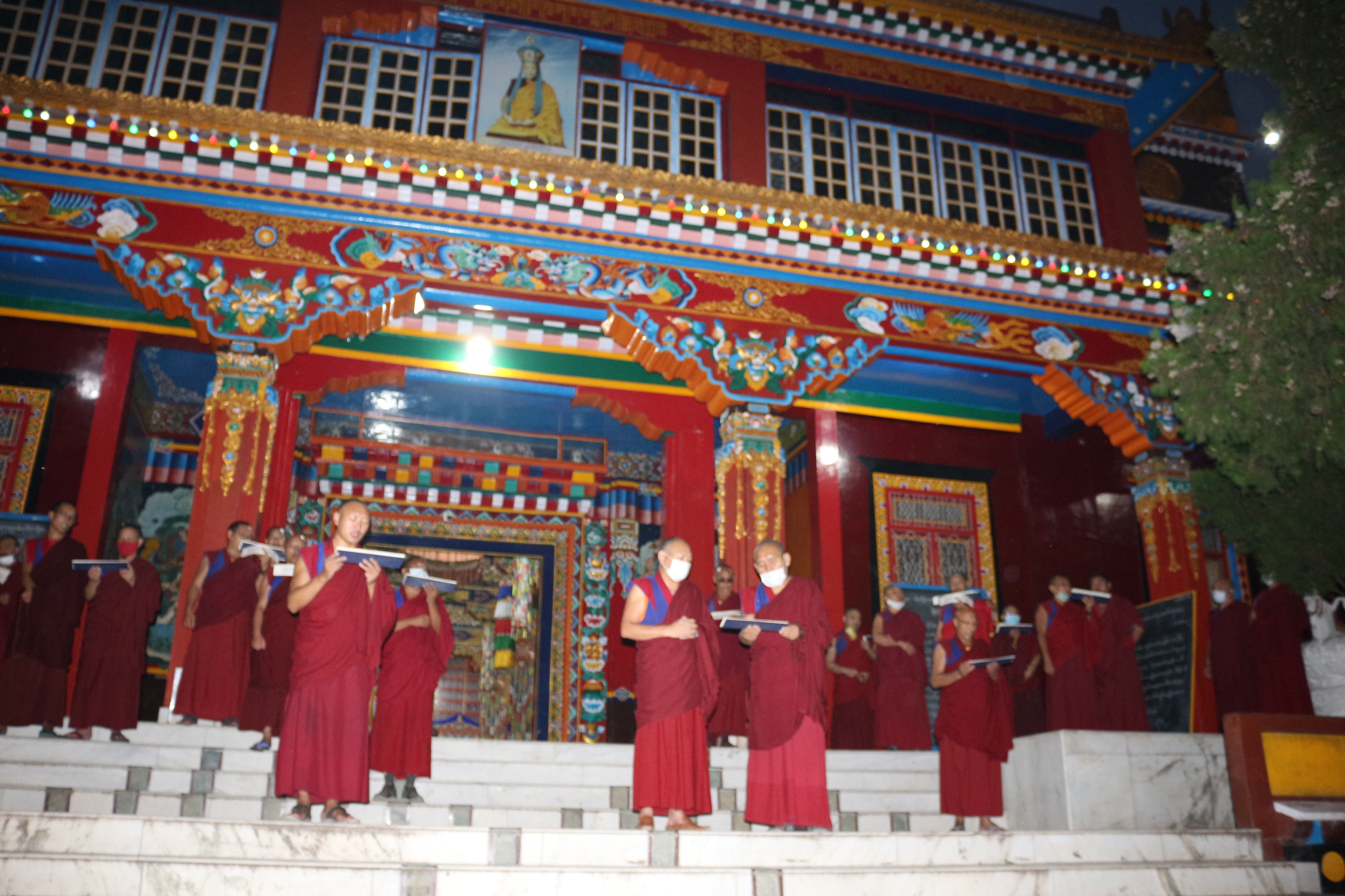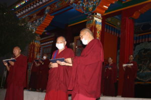འདུལ་མང་རྣམས་འདུལ་ཁང་ཆེན་མོའི་སྒོ་འབྱོར་ནས་ཞལ་མར་གྱུ་ནས་གཤེན་གྱི་དགེ་སྤྱོད་མདོ་ཆོག་ལྟར་ལན་ཆགས་གླུད་ཀྱི་ཚིག་བཤད་དང་མདོ་ཟློག་གསུང་ནས་གླུད་དང་ཉུ་ལེ་བཀར་བ་དང་ཞལ་ཡར་གྱུ་ནས་ཞི་གྱུར་དང་སྨོན་ལམ་སོགས་གདབ། ཚོགས་གྲལ་དུ་འཁོད་ནས་རྣམ་རྒྱལ་ནོར་བུའི་སྨོན་ལམ་དང་གཏོར་མའི་སྨོན་ལམ་ས་བཅུ་སྨོན་ལམ་སོགས་སྨོན་ལམ་རྣམ་གསུམ་གསུང་གྲུབ་རྗེས། དཔོན་གསས་བླ་མ་༧སྐྱབས་རྗེ་སྨན་རིའི་ཁྲི་འཛིན་རིན་པོ་ཆེ་མཆོག་གིས་བསྔོ་བ་བདེ་ལེགས་ཀུན་འབྱུང་མ་གསུང་ཞིང་མཆོད་འབྲེལ་བྱུང་བའི་རྒྱུ་སྦྱོར་ཡོན་གྱི་བདག་པོ་བདག་མོ་དང་ཚེ་འདས་རྣམས་ཀྱི་མིང་བྱང་རེ་རེ་བཞིན་ཀློག་རྗེས་འདུས་མང་ཡོངས་ནས་བསྔོ་སྨོན་སོགས་གསུང་ནས་བོད་ལྕགས་བྱི་ལོའི་གཤེན་གྱི་དཀའ་ཐུབ་ཡོངས་སུ་མཇུག་གྲུབ་ཡོད་པ་བཅས་སོ།