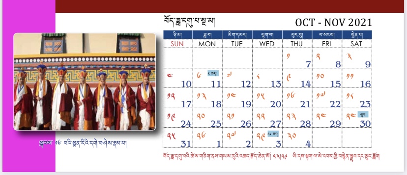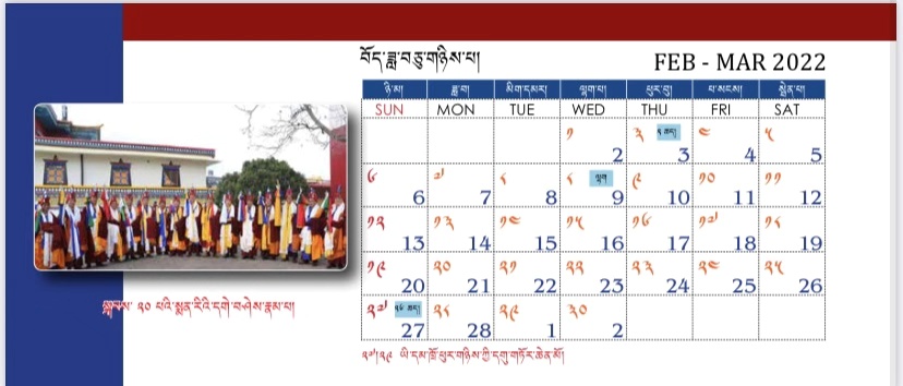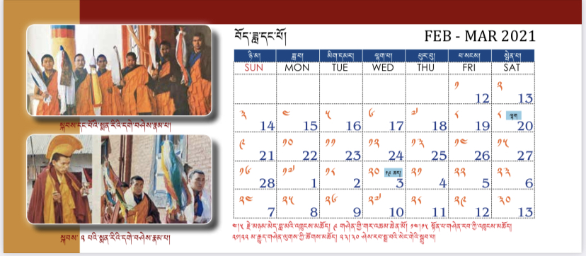 བོད་ཟླ་གཉིས་པར། ༢༣།༢༩ཡི་དམ་དབལ་གསས་ཞི་དྲག་གཉིས་ཀྱི་སྒྲུབ་པ་བཅས་སོ། ། བོད་ཟླ་གསུམ་པར། ༢༡སྨན་རིའི་ཡོངས་འཛིན་སངས་རྒྱས་བསྟན་འཛིན་གྱི་འདས་མཆོད་དང་། ༢༣།༢༩རྩ་གསུམ་བོན་སྐྱོང་བཞི་སྦྲགས་ཀྱི་སྒྲུབ་པ་བཅས་སོ། ། བོད་ཟླ་བཞི་པར། ༡༤།༡༥རྒྱལ་བའི་བཀའ་འགྱུར་རིན་པོ་ཆེ་ལྗགས་ཀློག་དང་། ༢༤།༢༩ཡི་དམ་རིག་འཛིན་འདུས་པའི་སྒྲུབ་པ་བཅས་སོ། ། བོད་ཟླ་ལྔ་པར། ༡༢།༡༦བོན་གཞིས་ཐོབ་རྒྱལ་གསར་པའི་སྤྱི་རིམ་ཆེན་མོ་མཁའ་ཀློང་གསང་བའི་མདོས་ཆེན་སོགས་དང་། ༢༣།༢༩ཀུན་གསལ་བྱམས་མ་ཆེན་མོའི་སྒྲུབ་པ་བཅས་སོ། ། བོད་ཟླ་དྲུག་པར། ༨རྗེ་མཉམ་མེད་བླ་མའི་འདས་མཆོད་དང་། ༡༠སྨན་རིའི་སྒྲུབ་ཁང་དབང་དྲག་ཕོ་བྲང་གི་དུས་ཆེན། ༡༤།༡༥ཞི་ཁྲོའི་ཚོགས་བརྒྱ་དང་ཉི་ཟེར་ཞགས་པའི་བྱང་ཆེན། ༢༣།༢༩གཤེན་རབ་རྣམ་པར་རྒྱལ་བའི་སྒྲུབ་པ་བཅས་སོ། །