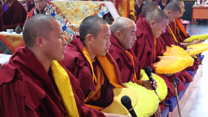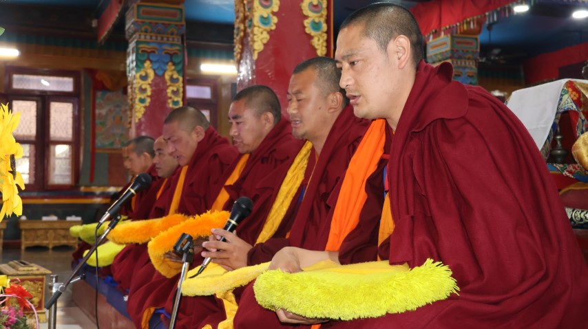 ཕྱི་དྲོའི་ཆུ་ཚོད་ ༡།༣༠ སྟེང་གོང་ལྟར་༧སྐྱབས་རྗེ་མཁན་སློབ་རྣམ་པ་དང་གཞན་ཡང་བཀའ་རམས་པ་སོ་སོའི་སྐུ་མགྲོན་དང་སེར་སྐྱ་མི་མང་འདུས་འཚོགས་ཐོག གོང་གསལ་བཀའ་རམས་པ་རྣམས་དགེ་བཤེས་དམ་བཅའ་ཆེན་མོ་འཚོགས་གནང་ཡོད་པ་དང་། འཚོགས་བཞུགས་དགེ་བཤེས་རྒན་རིམ་བཞིན་བླ་མེད་རྫོགས་པ་ཆེན་པོའི་སྐོར་ནས་རྟགས་གསལ་བཏང་གནང་ཞིང་ ༣ པར་གསོལ་ཇ་དང་ཁ་ཟས་བཞེས་གྲུབ་མཚམས་སྐར་མ་ ༡༥ ཙམ་གྱི་རྗེས་ནས་སླར་ཡང་སྔར་ལྟར་གོ་རིམ་བཞིན་རྟགས་གསལ་བཏང་གནང་ནས་དུས་ཚོད་ ༥།༠༠ སྟེང་གྲོལ་ཡོད་པ་རེད། དེ་རྗེས་སྐར་མ་བཅོ་ལྔ་ཙམ་གྱི་རྗེས་འདུས་མང་ཡོངས་ནས་འདུལ་ཆོག་གི་སྒོ་དབྱེ་དང་སྨོན་ལམ་རྣམ་གསུམ་གསུང་ནས་བཞེས་ཐུག་མཆོད་རྗེས་སྐབས་ ༢༣ པའི་དགེ་བཤེས་མཛད་སྒོ་ཉིན་བཞི་པ་དེ་ཉིད་མཇུག་གྲུབ་ཡོད་པ་དང་།