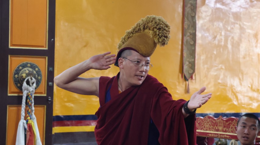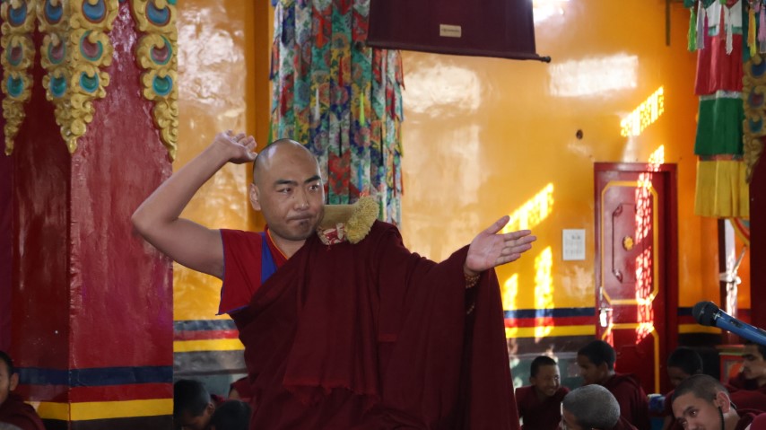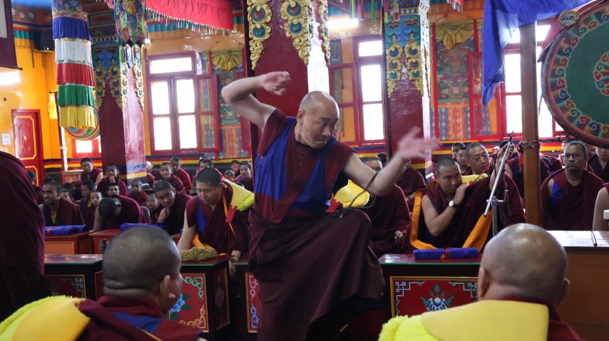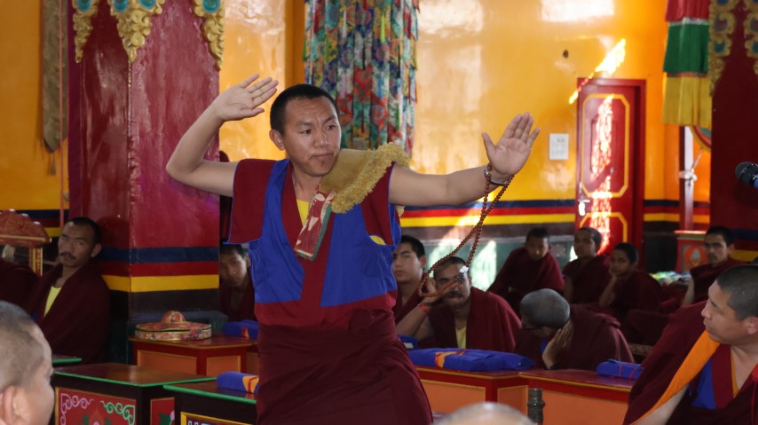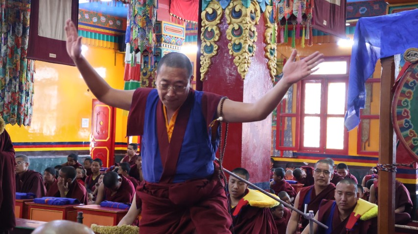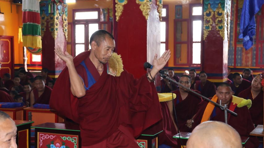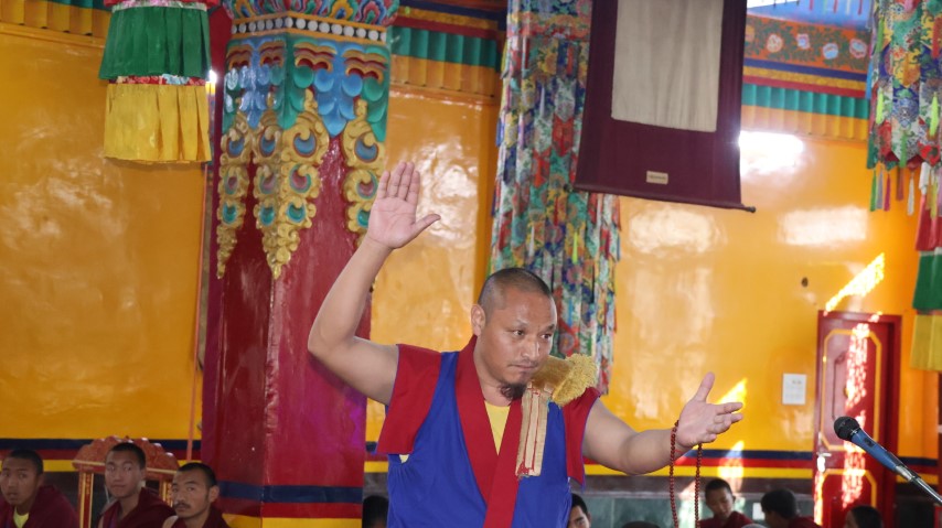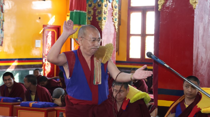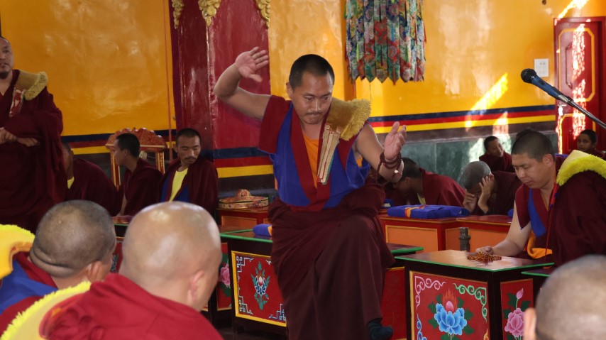 དེ་མཚམས་འདུས་མང་ཡོངས་ནས་ཀུན་གསལ་བྱམས་མའི་སྔགས་བསྟོད་དང་ཇ་མཆོད་ཟླ་བྲལ་ཨ་དཀར་གྱེར་གྲུབ་མཚམས་ཚོགས་ཆེན་ཞལ་ངོ་ནས་ཉིན་འདིའི་དམ་བཅའ་བ་བཀའ་རམས་པ་རྣམས་ལ་ཆབ་ཕུལ་མཚམས་སྔར་སྲོལ་ལྟར་༧སྐྱབས་རྗེ་མཁན་སློབ་རྣམས་ལ་མཇལ་ཁ་ཞུས་རྗེས་གྲལ་མཇུག་ནས་རྩེ་ཞྭ་ཕྱག་ཏུ་བསྣམས་ནས་ལུས་གུས་པ་དང་བཅས་བསྟན་གཙོའི་མདུན་གྱི་དམ་ཁྲིར་བཞུགས་ཏེ་ དཀའ་ཆེན་གྱིས་ “མཚན་ཉིད་དམ་བཅའི་དབུ་འཆད་པད་དཀར་ཆུན་པོ་” དང་དཀའ་ཆུང་རྣམས་ཀྱིས་”དམ་བཅའི་ཚིག་བཤད་མན་དྷ་ར་བའི་འཕྲེང་བ་”གཉིས་རིམ་བཞིན་ངག་རྒྱུགས་ཕུལ་གྲུབ་མཚམས་བར་ཆད་ལམ་སེལ་གསུང་ཞིང་འཚོགས་གྲོལ།