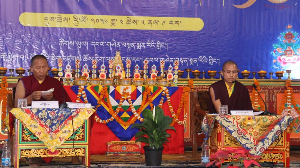 དེ་རིང་ཞོགས་པ་དུས་ཚོད་བརྒྱད་པའི་ཐོག་ཚོགས་ཐུན་ལྔ་པ། འབོ་དཀར་བཤད་གྲྭ་འོད་འབར་འཆི་མེད་གླིང་གི་མཁན་པོ་འཇམ་དབྱངས་སེང་གེ་མཆོག་གི་གཙོ་སྐྱོང་འོག གདན་ས་བཀྲིས་ལྷུན་པོའི་དཀའ་ཆེན་ལྷ་རམས་པ་རྡོ་རྗེ་རྒྱལ་མཚན་མཆོག་གིས་བསྟན་བཅོས་མངོན་པར་རྟོགས་པའི་རྒྱན་གྱི་དབུའི་རྒྱ་གར་སྐད་དུ་ཞེས་པ་ནས་བདེ་བླག་ཏུ་ནི་རྟོག་པ་ཞེས་པའི་བར་གྱི་དཔྱད་རྩོམ་“བློ་དམན་མཆོད་བརྗོད་ལ་མཇུག་པའི་ཐེམ་སྐས་དང་པོ་བཞུགསོ་”ཞེས་པའི་ཐོག་ས་བཅད་མཚན་དོན་དང་འགྱུར་ཕྱག་བཤད་པ། བཤད་པ་ལ་མཇུག་པའི་མཆོད་བརྗོད་བཤད་པ། མཁྱེན་གསུམ་གྱིས་དོན་མངོན་པར་རྟོགས་པ་བརྒྱད་བསྡུས་ཚུལ་བཤད་པ། བསྟན་བཅོས་འདིའི་དགོས་འབྲེལ་ངག་བཤད་པ་དང་བཞིའི་སྒོ་ནས་གསུང་བཤད་དང་དེའི་ཐོག་ཚོགས་བཅར་བ་རྣམས་ཀྱིས་དྲི་བ་དྲིས་ལན་གྱི་བགྲོ་གླེང་གནང་ཞིང་།