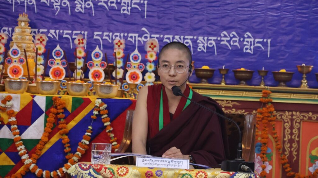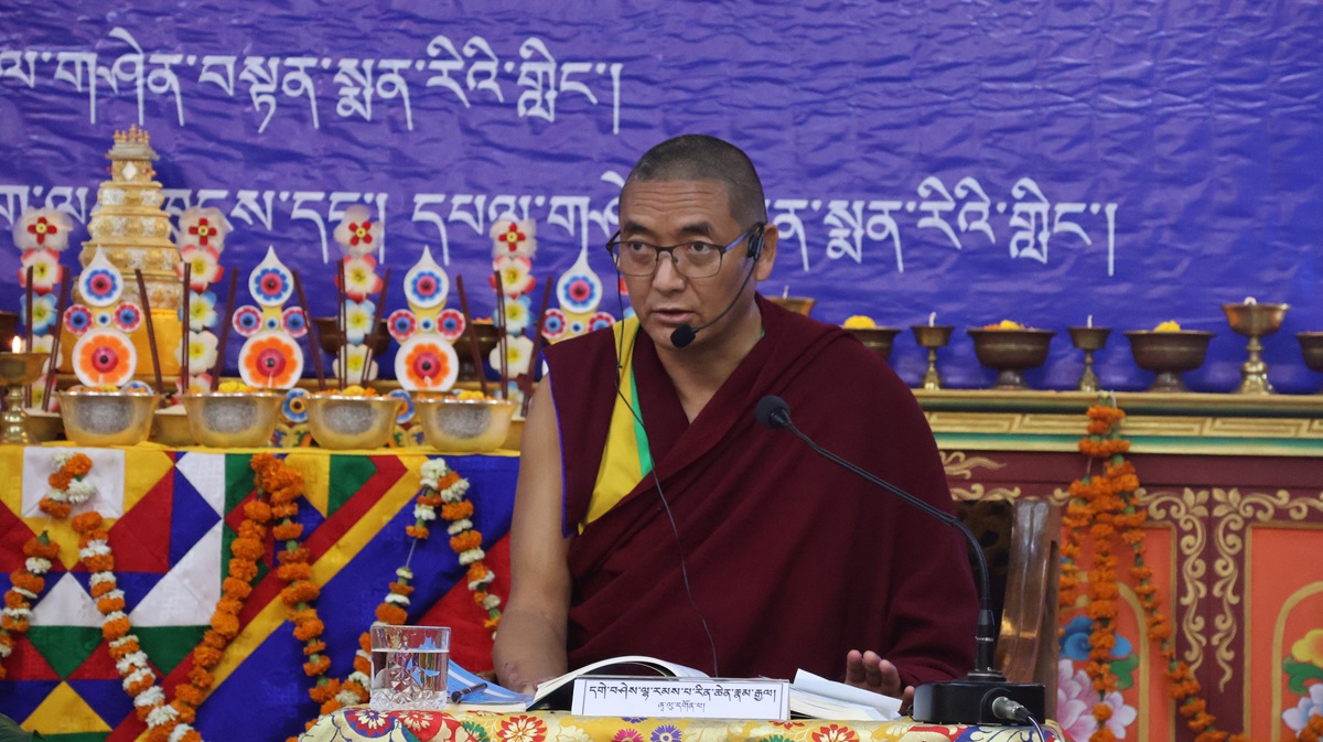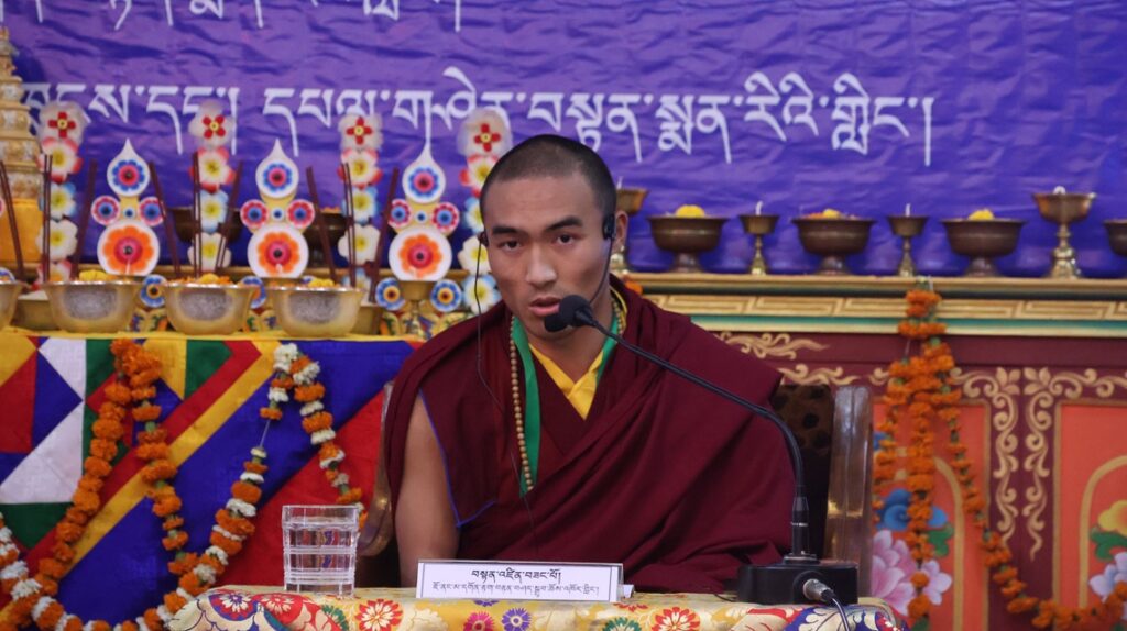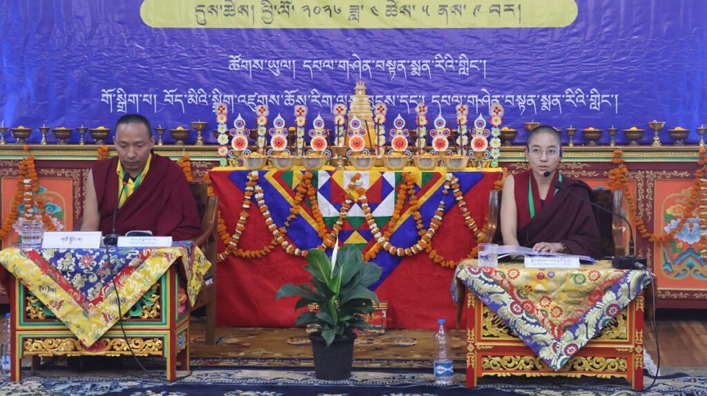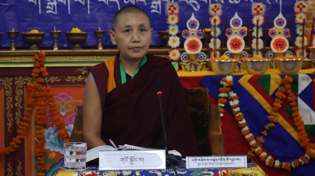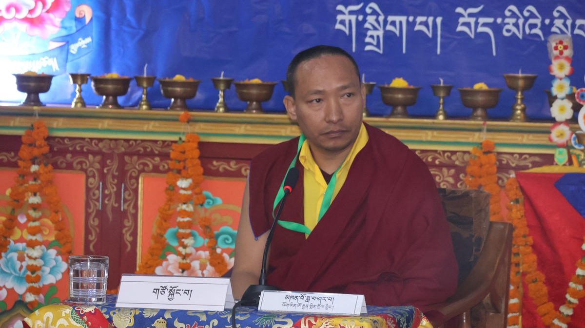 དུས་ཚོད་ ༡༡་༡༥ ནས་ཚོགས་ཐུན་བཅོ་བརྒྱད་པ། འོག་མིན་ཨོ་རྒྱན་སྨིན་གྲོལ་གླིང་གི་མཁན་པོ་ཟླ་བ་ཤར་པ་མཆོག་གི་གཙོ་སྐྱོང་འོག བཙུན་དགོན་མཚོ་རྒྱལ་བཤད་སྒྲུབ་གླིང་གི་སློབ་དཔོན་མ་པ་སངས་ལྷ་མོ་གུ་རུང་མཆོག་གིས་དཔྱད་རྩོམ་“མཐར་གྱིས་པའི་སྦྱོར་བའི་སྐོར་ལ་དཔྱད་པ་བློ་དམན་བྱིས་པའི་རི་མོ་”ཞེས་པའི་ཐོག་སྐབས་དྲུག་པ་མཐར་གྱིས་པའི་སྐོར་མདོ་དང་བསྟན་བཅོས་ནས་བསྟན་ཚུལ། མཚན་ཉིད། དབྱེ་བ། ས་མཚམས་ལ་བཞེད་པ་མི་འདྲ་ཚུལ། རྟོགས་པ་བརྟན་པར་བྱེད་ཚུལ། བརྟན་པ་ཐོབ་པའི་ཚད། རྣམ་པ་གོ་རིམ་ངེས་ཅན་དུ་སྒོམ་པའི་དོན། ཉམས་ལེན་གཅིག་ལ་ཀུན་བསྡུས་ཚུལ། མཐར་གྱིས་པའི་སྦྱོར་བའི་དགོས་པ་བཅས་ཀྱི་སྒོ་ནས་གསུང་བཤད་དང་དེའི་ཐོག་བགྲོ་གླེང་གནང་གྲུབ་མཚམས་ཉིན་གུང་གསོལ་ཚིགས་བར་གསེང་གནང་ཞིང་།