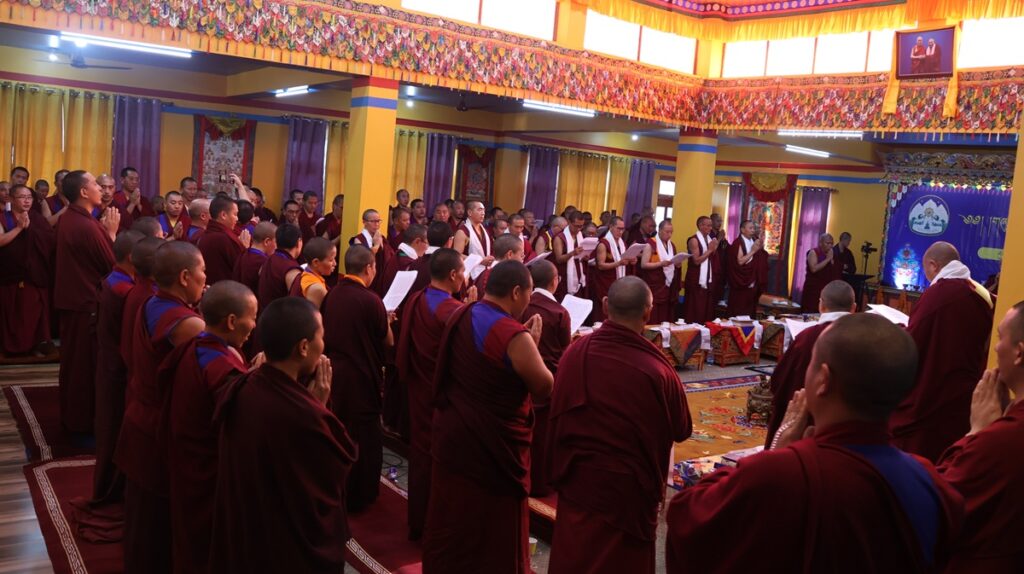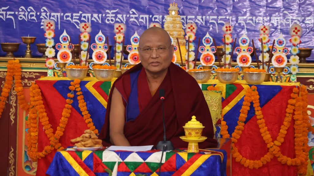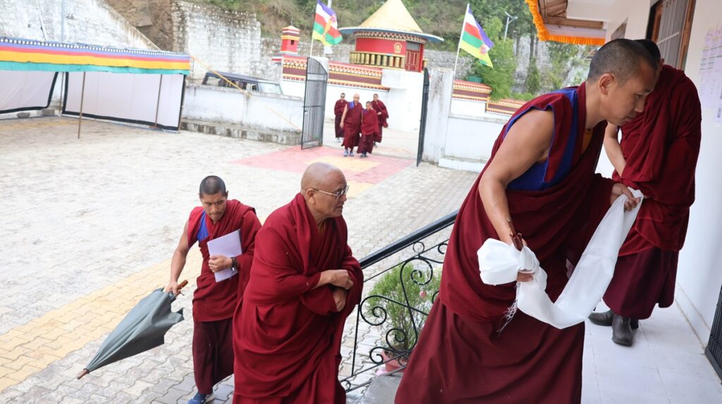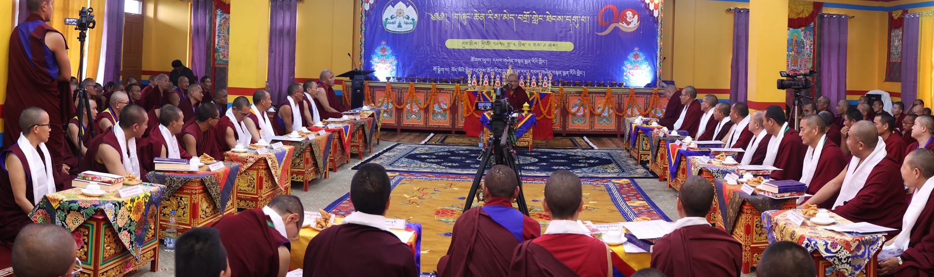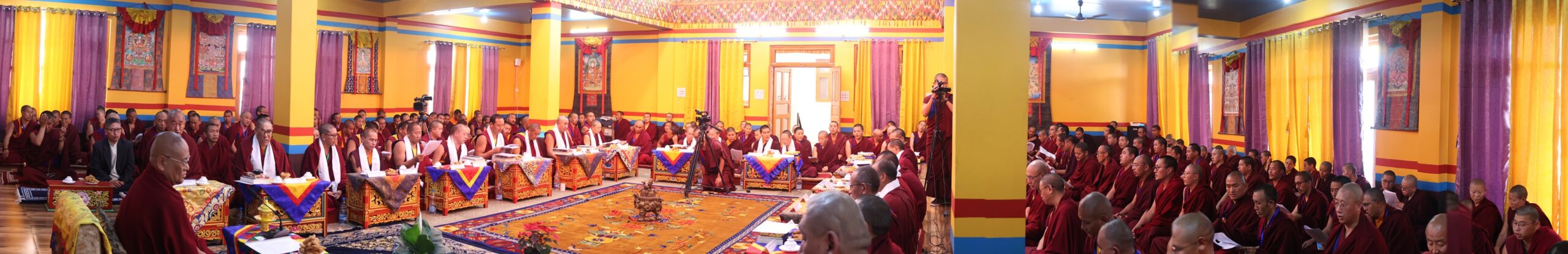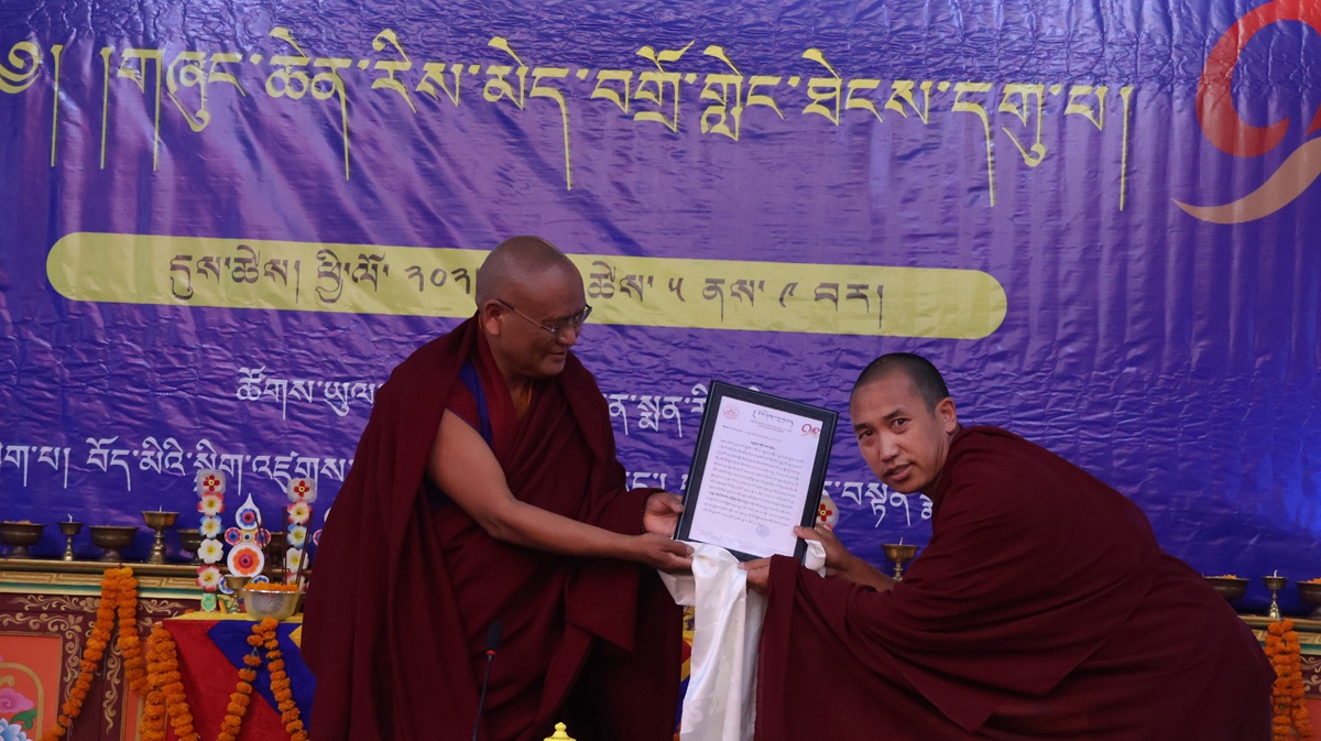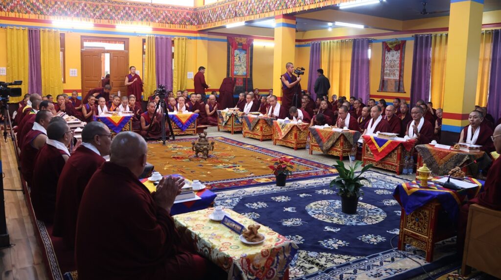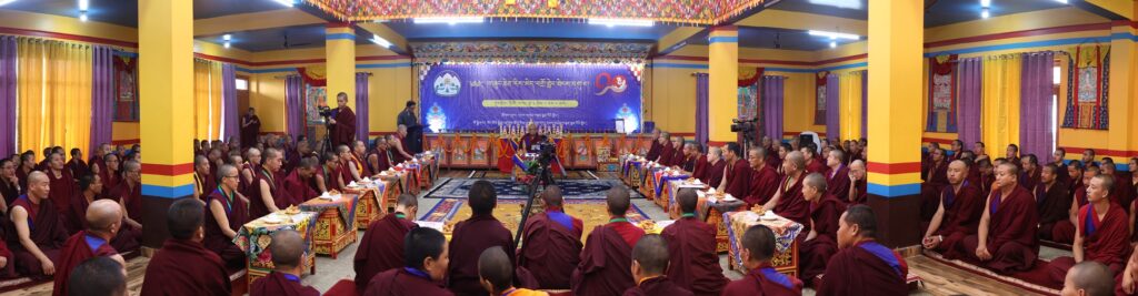 ཚོསག་ཆེན་དབུ་མཛད་ཆེན་མོས་འདོན་པ་དབུ་འཛུགས་ཀྱིས་འདུས་མང་ཡོངས་ནས་སྨོན་ལམ་རྣམ་གསུམ་གསུང་གྲུབ་མཚམས་༸སྐྱབས་རྗེ་རྒྱལ་བ་སྨན་རིའི་དཔོན་སློབ་རིན་པོ་ཆེ་མཆོག་ན་བསྔོ་བ་བདེ་ལེགས་མ་གསུངས་གནང་བ་དང་། དེ་རྗེས་གསོལ་ཇ་འདེགས་འབུལ་ཞུས་ཤིང་མཐར་གཡུང་དྲུང་བསྟན་པ་རྒྱས་པའི་སྨོན་ལམ་གསུངས་ཏེ་ཆོས་རྒྱུད་རིས་མེད་གཞུང་ཆེན་བགྲོ་གླེང་ཐེངས་དགུ་པ་ཡོངས་སུ་མཇུག་གྲུབ་ཡོད་པ་བཅས་ཀྱི་གནས་ཚུལ་གཡུང་དྲུང་བོན་གྱི་དྲྭ་ཚིགས་གཙོ་སྒྲུབ་ཁང་ནས།